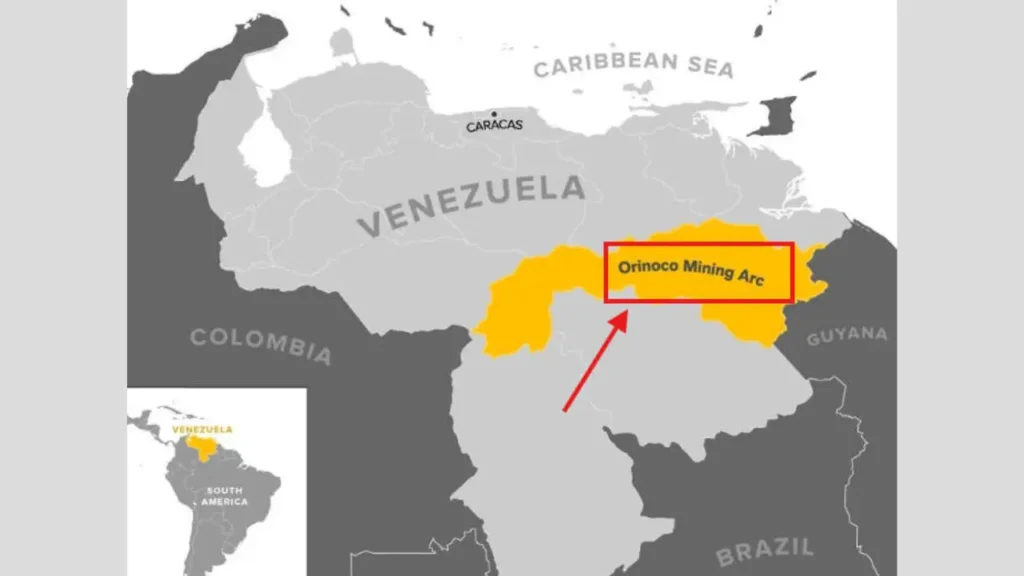 ベネズエラのオリノコ鉱山アークは地図上で強調されています