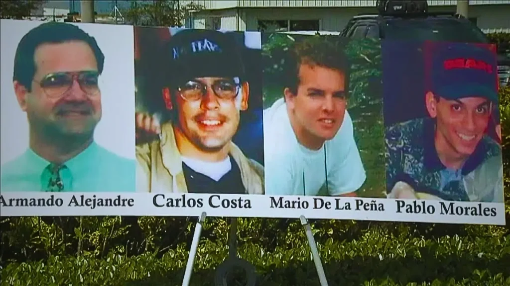 「ブラザーズ・トゥ・ザ・レスキュー」は、フロリダ海峡をボートで命がけで渡ろうとするキューバ難民を発見・救助する人道支援組織です。1996年2月24日、同組織の民間機2機がキューバ軍のMig戦闘機に撃墜され、アルマンド・アレハンドレ・ジュニア、カルロス・コスタ、マリオ・デラペーニャ(いずれも米国市民)、パブロ・モラレスの4名が死亡しました 。撃墜は国際水域の上空で発生したものであり、国際法の明白な違反行為とみなされています。