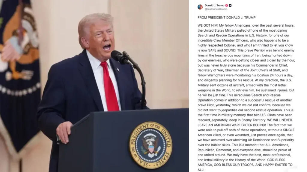 我々は彼を確保したぞ! 親愛なるアメリカ国民の皆様、ここ数時間にわたり、米軍は米国史上最も大胆な捜索救助作戦の一つを成功させました。対象となったのは、我々の素晴らしい乗組員の一人であり、同時に高く尊敬されている大佐でもある人物です。そして、彼が今や無事であることを皆様にお知らせできることを、私は大変嬉しく思います!
