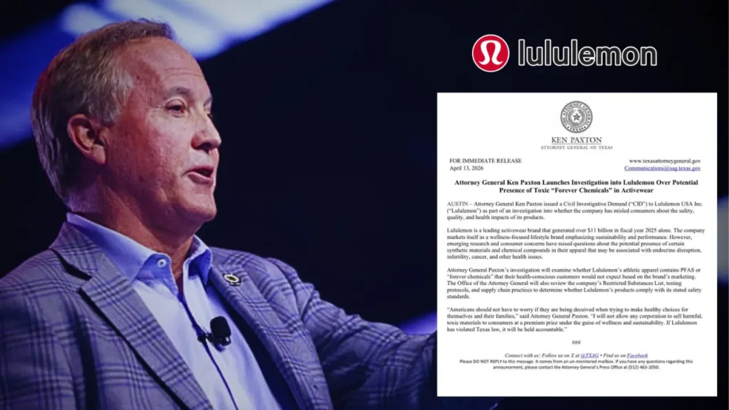 テキサス州司法長官ケン・パクストン氏が、人気アスレジャーブランド「ルルレモン」の衣服に「永遠の化学物質」として知られるPFAS(ペルフルオロアルキル化合物)が含まれている可能性があるとして、法的調査を開始しました。健康志向の消費者を標的としたプレミアムブランドが、実は消費者を欺いていた疑いが浮上しています。