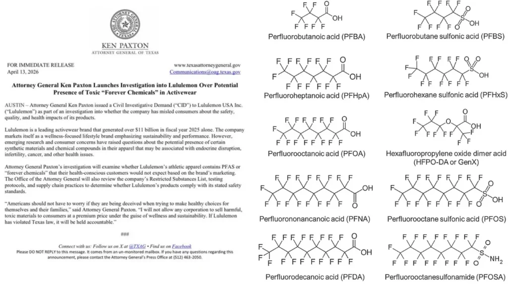 2026年4月、テキサス州司法長官ケン・パクストン氏は、カナダ発祥の高級アスレジャー(Athletic アスレチック+Leisure レジャー:運動と余暇を意味する2語をつなげた造語で、ヨガやピラティスの服装を日常のファッションとして取り入れたスタイル)ブランド「ルルレモン」(Lululemon Athletica)に対し、民事調査要求(CID:Civil Investigative Demand)を正式に発行しました。 この調査要求は、同社の製品にPFASと呼ばれる「永遠の化学物質」が含まれているかどうか、また消費者に対して製品の安全性、品質、健康への影響について虚偽の表示を行っていた可能性があるかどうかを解明するためのものです。